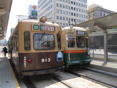 路面電車は、昔の大市交や京市交の車両も現役で走っている。新型列車に飲まれそうになりながら・・・。
