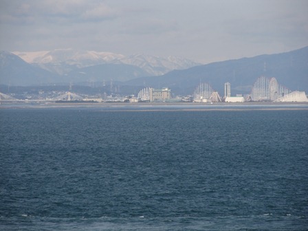三重県側の陸地を見ると、津港や青山高原。更に北側を見ると長島の遊園地や雪を被った伊吹山系が見える。