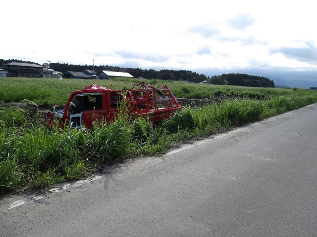 運転席が潰れた消防団の消防車。奥に見えるハンドルの曲がった耕耘機。