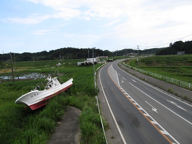 国道沿いに打ち上げられた漁船。7月のままだった。
