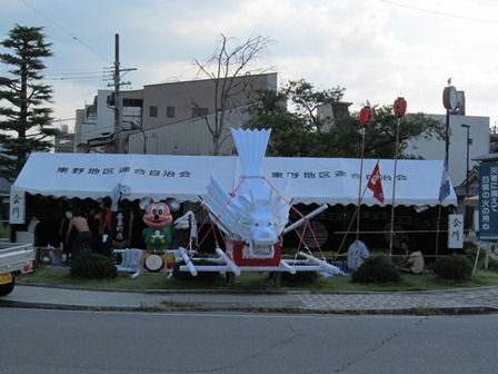 祭りの準備も進んでいる。 綺麗な白い龍だなぁ・・・。紙で作っているのかな。しばし見とれた。でも横の人形は邪魔だが、お子様を寄せる為には仕方ないのかな。