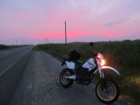 相棒のお腹(バイクのタンク)を一杯にしてやろうと、GSに突入。暗くなり始めていたので、距離感がつかめない。縁石に乗りそれを上って、GSの敷地へジャンプして突入。(暑さでへばってなかったら、間違いなくブレーキを掛けてロックさせて「大転倒」)。電気は付いていても、誰も居ないようだ。大声出しても、クラクション鳴らしても反応無し。