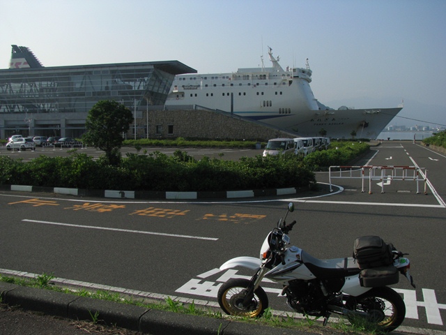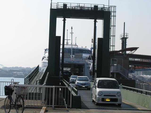 熊本港からの高速フェリーが到着し、車両や人が降りていった。 熊本港ゆき高速フェリーになり、バイクが最初の乗船。