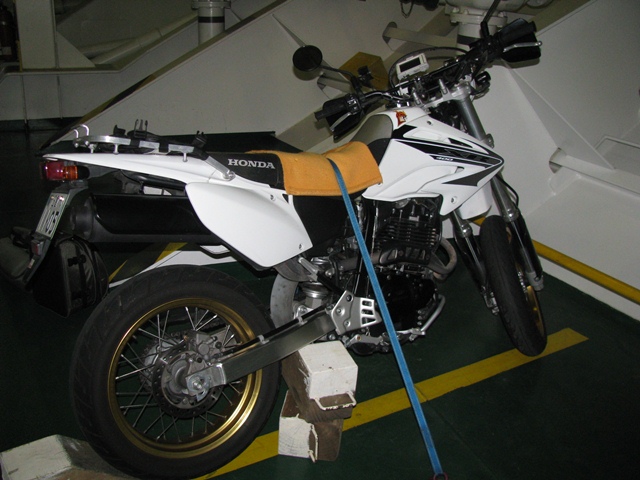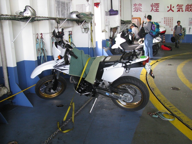 滑って転倒したら、恥ずかしいな。と思いながら緊張してゆっくりと誘導員の指示に従って乗船。バイクから荷物を降ろしたら甲板作業員が慣れた手つきでバイクを縛る。