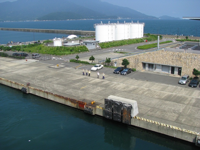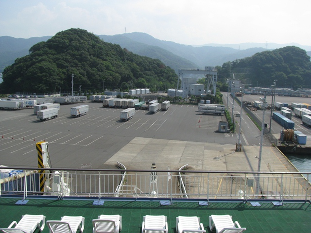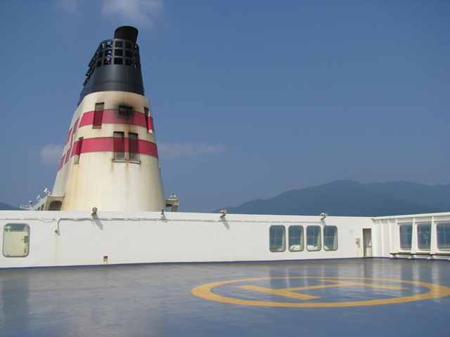出航前だったが、何となくビールが旨い。 ヘリコプターが離着陸できる最上階外部甲板って広いなぁ。田舎の盆踊りなら十分な広さだ。海風で櫓を建てることはできないが、太鼓鳴らしても大海原だから近所に迷惑はかからないし…。盆踊りあったら楽しそうだなぁ~と勝手に想像する。 ビールを飲み終えたので、またビールを買いに自販機に行ったら出港時間になった。あわてて外部甲板へ行く。
