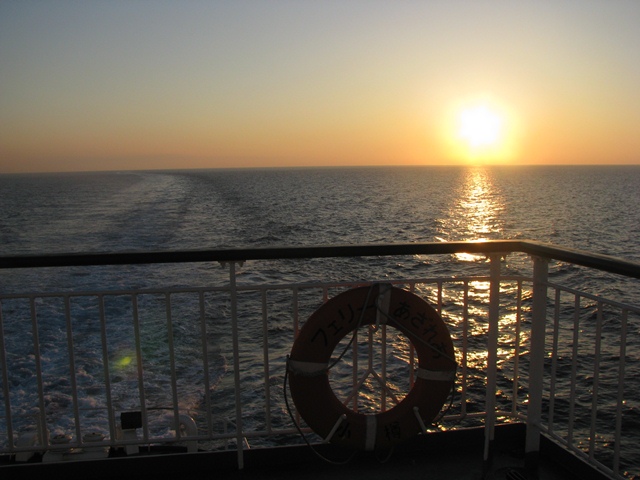 後は行き交う船を見たり、夕日を眺めたりしてました。日没前ぐらいから後部甲板ではジンギスカンの焼肉をやっていた。食べたかったが、食べるとビールを飲みたくなるので止めた。