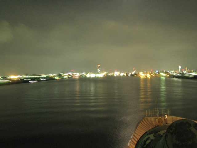 外部甲板を散策していると、前部外部甲板にたどり着くことができたので、入港時の写真を撮った。 (シャッター速度16秒で撮ったのに、2人の作業員は全く動いていない。人を運ぶ仕事に誇りを持って、作業に当たっているのか。素晴らしい!!)
